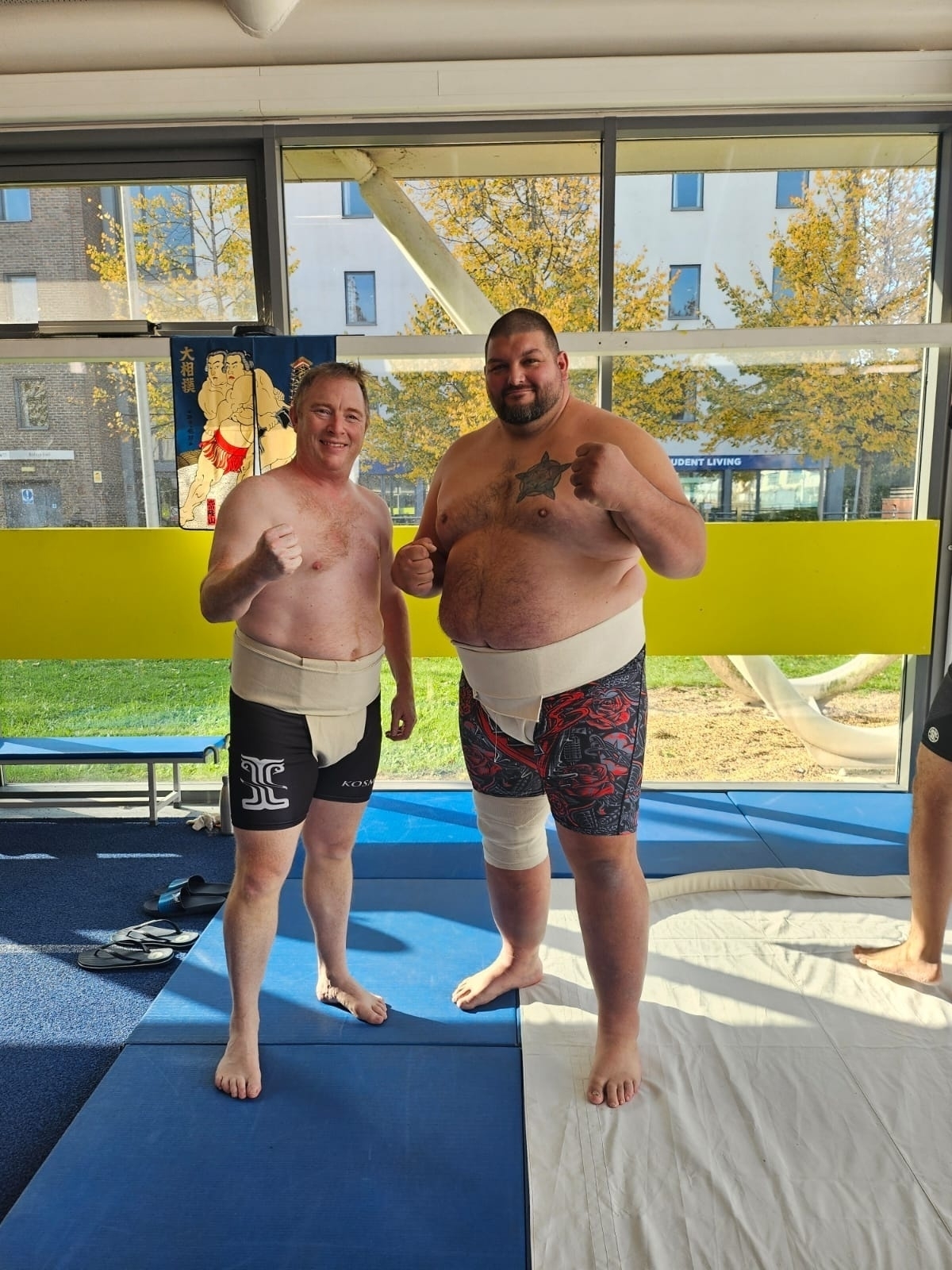 Come and train, Sumo is a great workout. Squats and stamps (shiko), stretching, crouched walks, and pushing other humans around!!